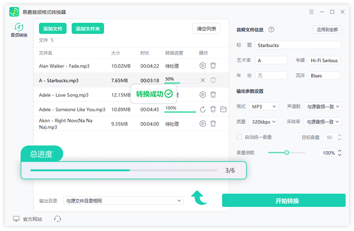 支持多文件批量转换,节省您的时间,提高效率,一次操作处理多个音频文件